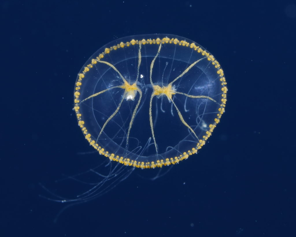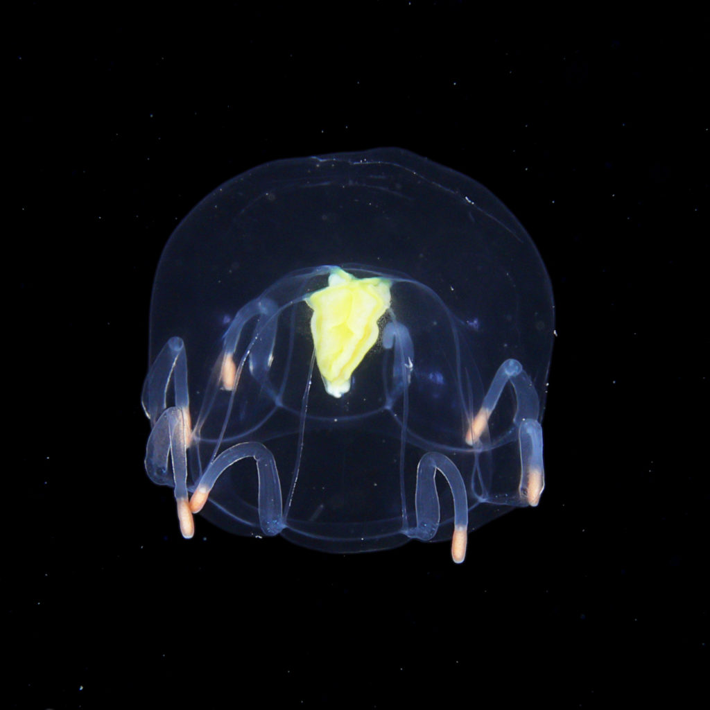 現在、淡水クラゲ目は世界で52種、日本では9種が知られています。しかしながら、分類学者によっては淡水クラゲ目にヒドロ虫綱の花クラゲ目の種を含めるなど、その分類は混乱しています。さらに近年、日本沿岸では淡水クラゲ目の未同定種がいくつも報告されてきました。沖縄で見つかった種については未記載種(新種)であることがわかり、コモチカギノテクラゲモドキ Scolionema sanshinという名をつけました(Toshino 2017)。最近では同じく沖縄近海からハナガサクラゲ属の未記載種を発見し、デイゴハナガサクラゲ Olindias deigoと名付けました(Toshino et al. 2019)。