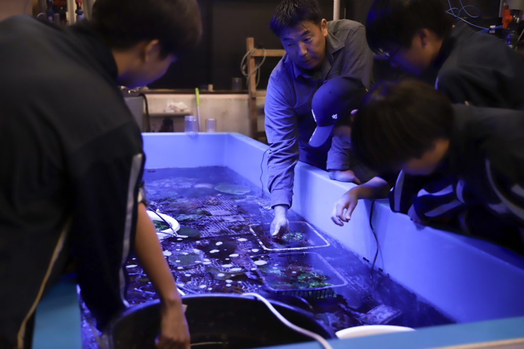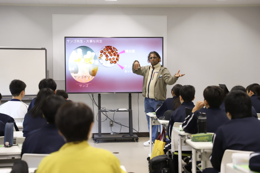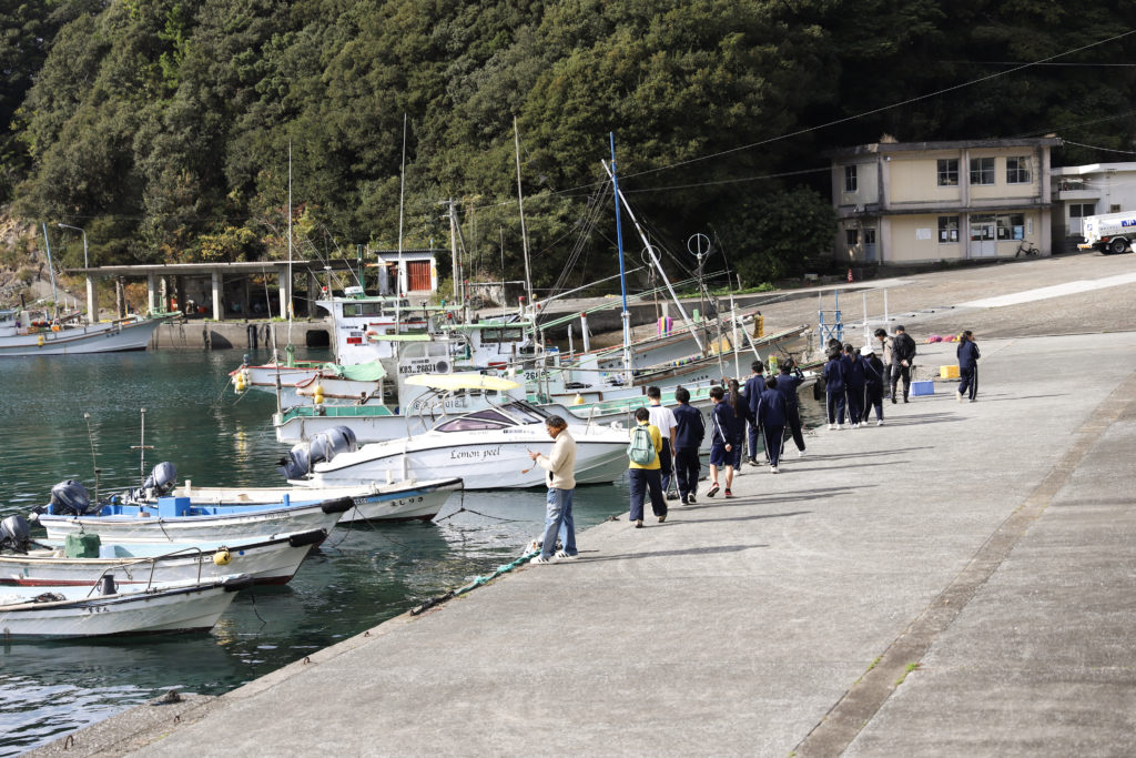 西泊の漁港から、サンゴや魚やクラゲを観察しました。