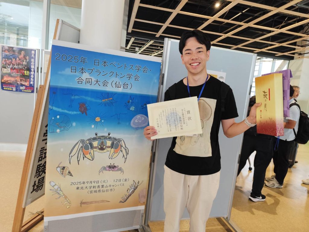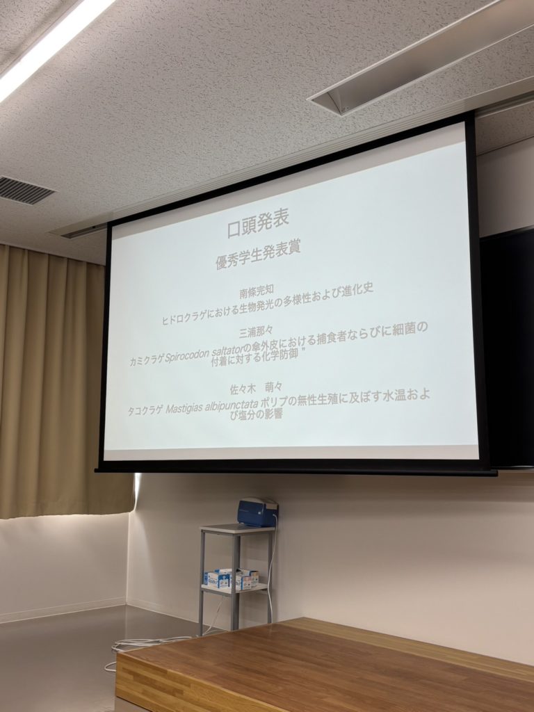 午後には優秀学生発表賞の表彰式が開催されました。今年は何と、クラゲ関連の発表が総なめすることに!研究所にも来てくれた東北大の南條完知さんが優秀賞を受賞しました!