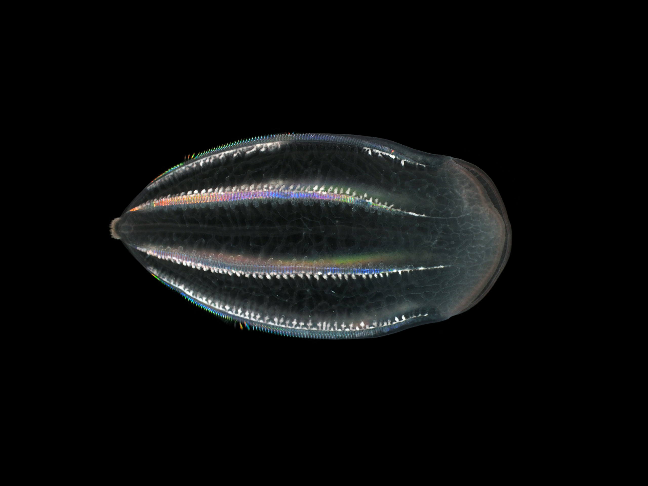 アミガサウリクラゲ Beroe forskalii Milne Edwards, 1841 ウリクラゲとよく似ているが、体は扁平で反口端は尖った円錐形に近く、水管は網目状になることから区別できる。日本沿岸の浅海域で見られるが、深海にも生息する。生物発光することが知られており、刺激を与えると体全体が青白く光る。この発光はホタルと同じ、熱をほとんど発しない冷光であると言われている。体長15 cmほどにまで成長する。(戸篠) 2026年2月 写真を追加 体長2 cmほどの幼体(高知県大月町産 2022年3月2日撮影) 高知県大月町産(2023年3月2日撮影) 櫛板に沿って卵が並ぶ