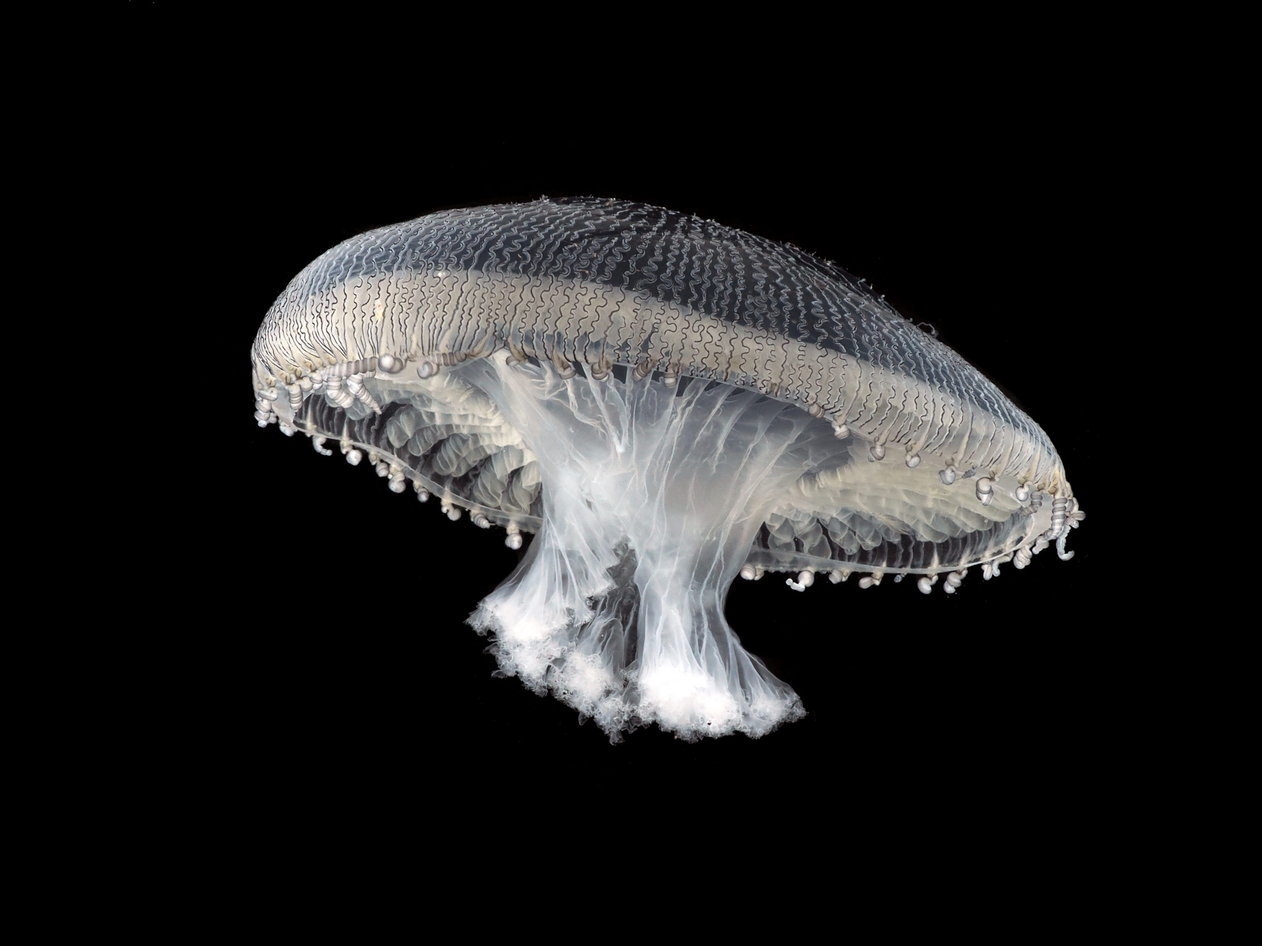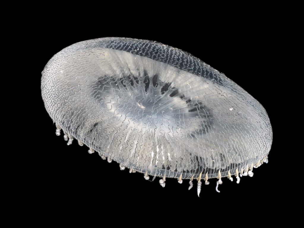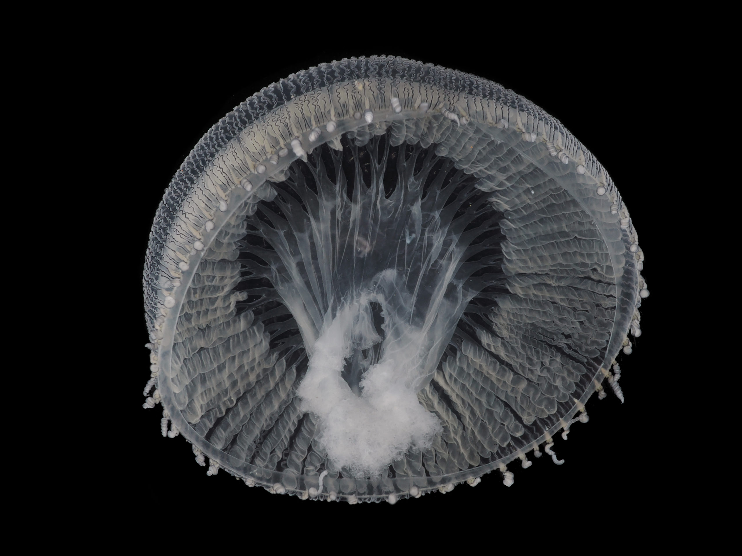 外見はゴージャスなシャンデリアのようで煌びやか。外傘全体に刺胞列が波打つように並ぶ。傘は椀状で傘径5~13 cmほど。傘縁には触手が20~50本ほど備わる。これまでジャワ海でのみ報告があったが、三重県鳥羽や静岡県大瀬崎、山口県下関など日本近海にも生息することがわかり、2015年に峯水らにより「カザリオワンクラゲ」と名付けられた。稀種で、水族館で展示されることもほとんどないため、知る人ぞ知るクラゲ。オワンクラゲと同様、ブラックライトを当てると傘の縁が鮮やかに光る。(戸篠)