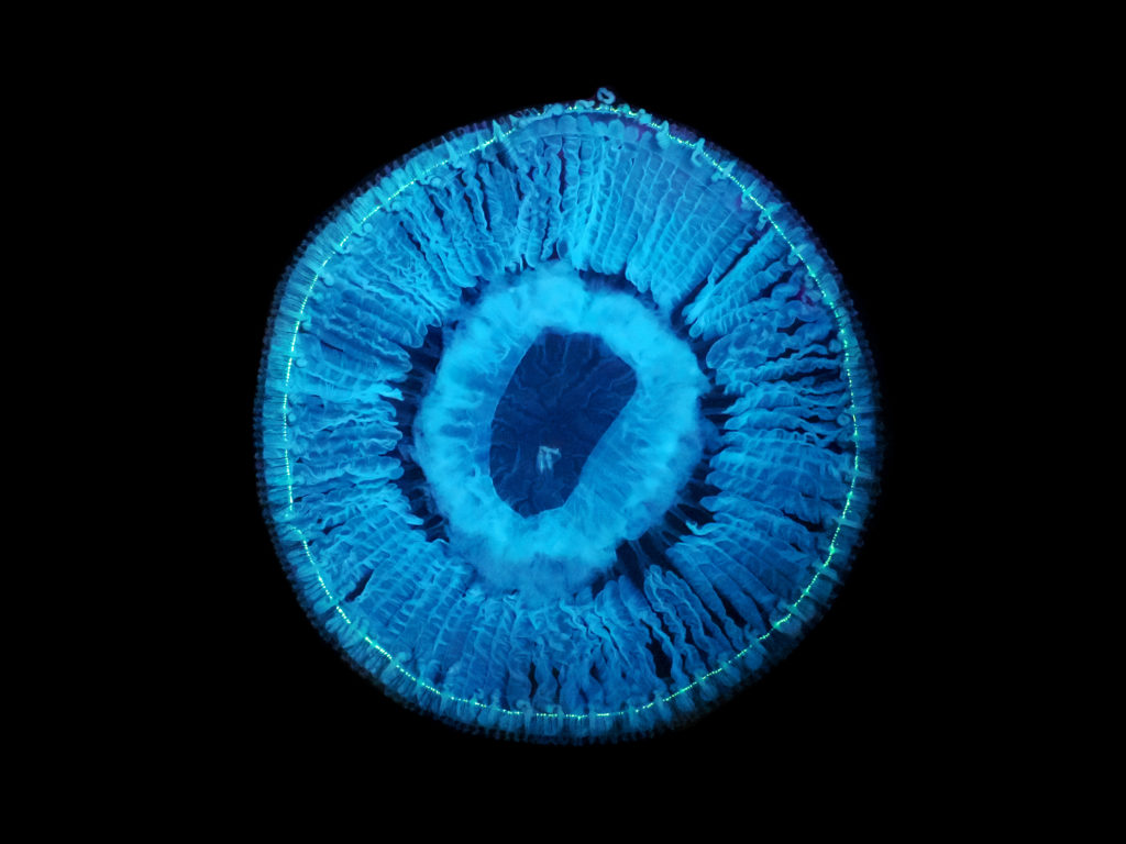 光るカザリオワンクラゲ(ブラックライトを照射)