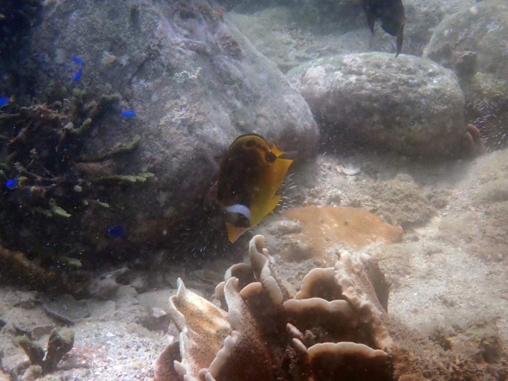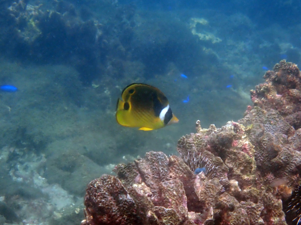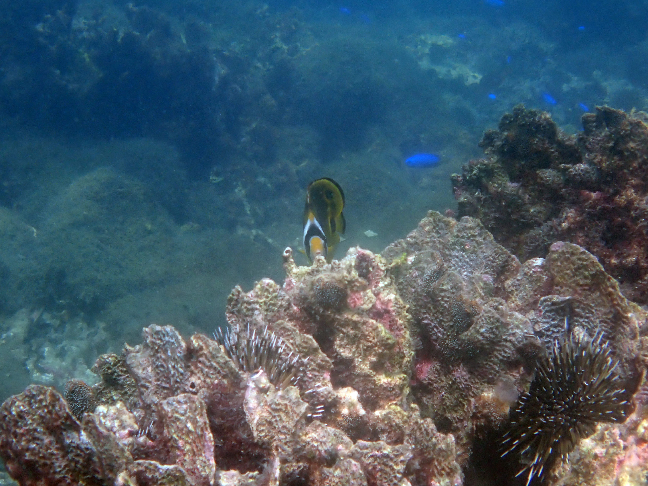 チョウハン Chaetodon lunula (Lacepède 1802) 体長25 cmほど。「チョウハン」の名は盗賊の熊坂長範(くまさかちょうはん)に由来するとされる。目の周りの黒い帯が盗賊を連想させるとの説もあるが、全体的な色彩、模様は和の美しさを感じる。英名は「Raccoon butterflyfish」(アライグマのチョウチョウウオ)なので、愛らしさMAXである。(戸篠) 高知県大月町(2025年10月2日撮影) シコロサンゴのポリプをついばむ様子 幼魚はサンゴの隙間を好む