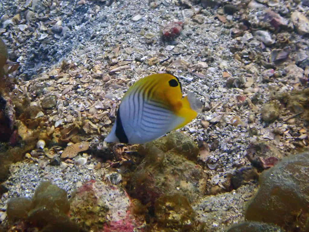 トゲチョウチョウウオ Chaetodon auriga Forsskål, 1775 体長は20 cmほど。「トゲ」の名があるように、成魚の背鰭の後方が糸状に伸びる。また、体側には斜走帯、頭部には眼を通る黒色帯、背鰭軟条に黒色斑がある。岩礁域やサンゴ礁域では普通にみられる種で、東北では季節来遊魚として現れる。サンゴのポリプや小型のイソギンチャク、多毛類などを食べる。(戸篠) 徳島県海陽町(2025年2月15日撮影)