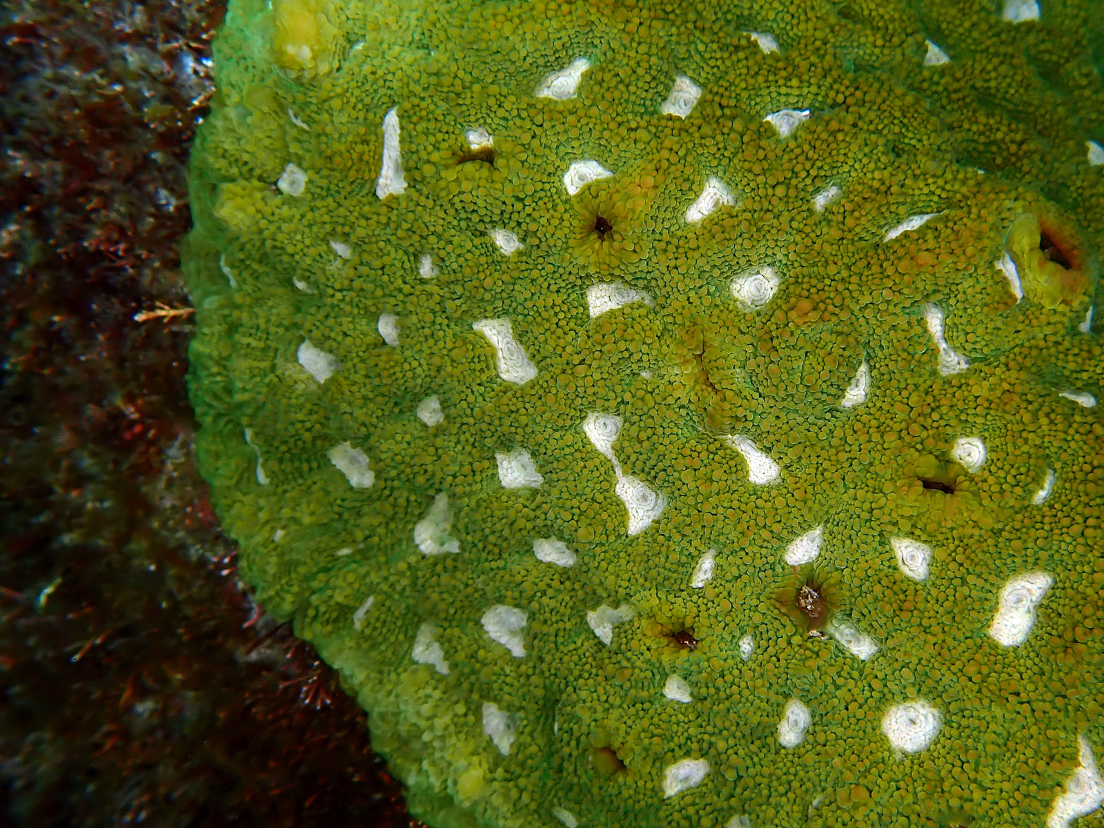 サンゴの群体形は被覆状。色は緑、赤、茶褐色などさまざま。群体は大型になることもある。