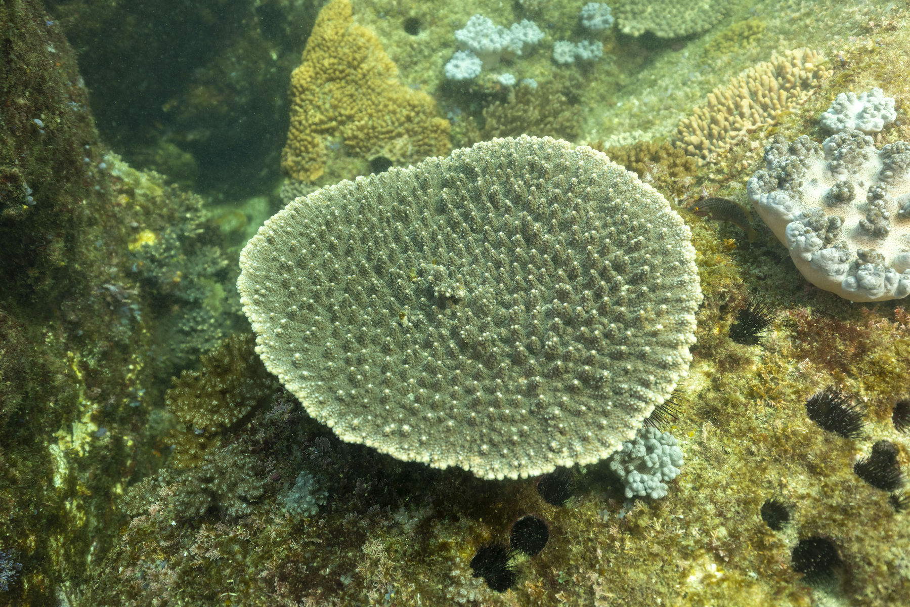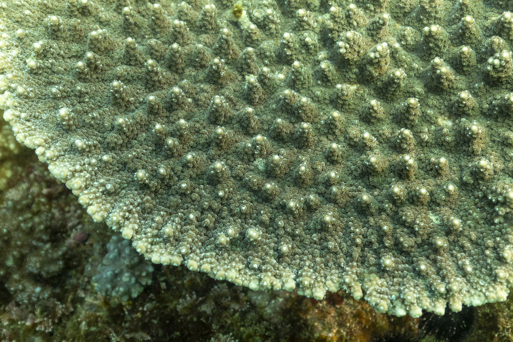 和名のとおり、円卓のような丸いテーブル状の形をしたサンゴ。同じ長さで垂直に伸びた小さい枝はほとんど分岐をしない。垂直に伸びる枝の長さは群体によって異なり、色も緑、茶褐色、写真のような色などさまざま。潮通しのよいところに多く、湾内には少ない。沖縄県などサンゴ礁域にはほとんど生息していない、高緯度サンゴの指標種。学名はAcropora solitaryensisやAcropora sp. ENTAKUと呼ばれていることもある。