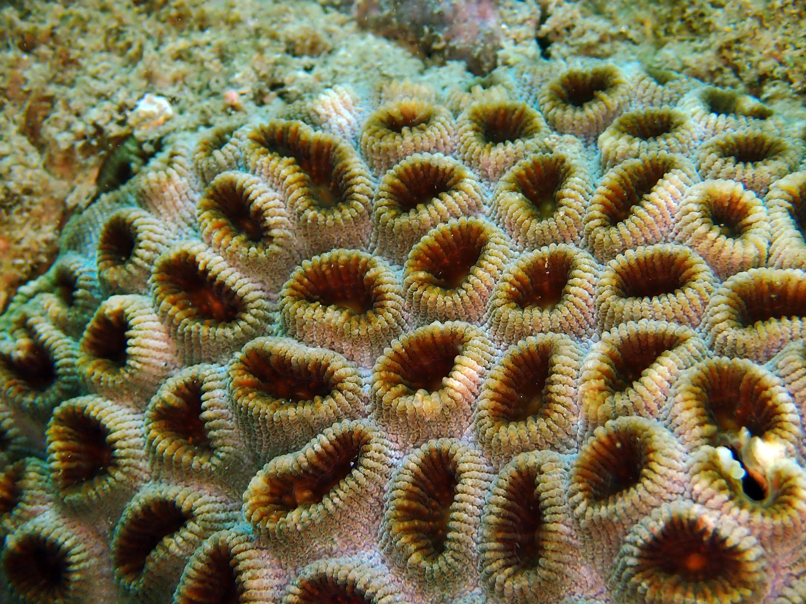サンゴの色は名前の通り薄茶をしているものもありますが、緑など多様。群体の形は塊状から準塊状で、サンゴ個体1個の大きさは6 mmから1cm程度になり、写真のように群体によっては山のように突出します。同じ属のキクメイシによく似ていますが、本種よりサンゴ個体は大きい。