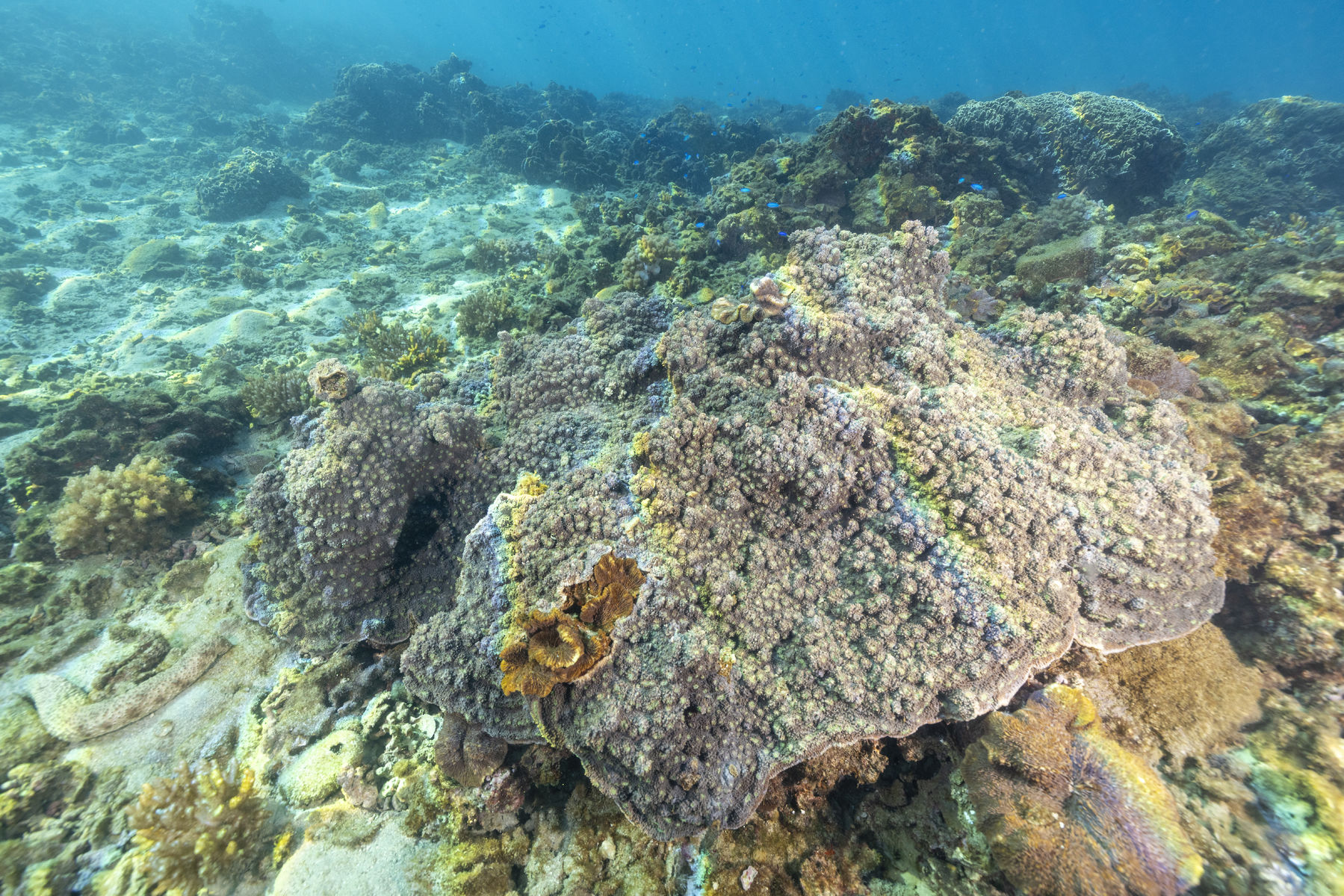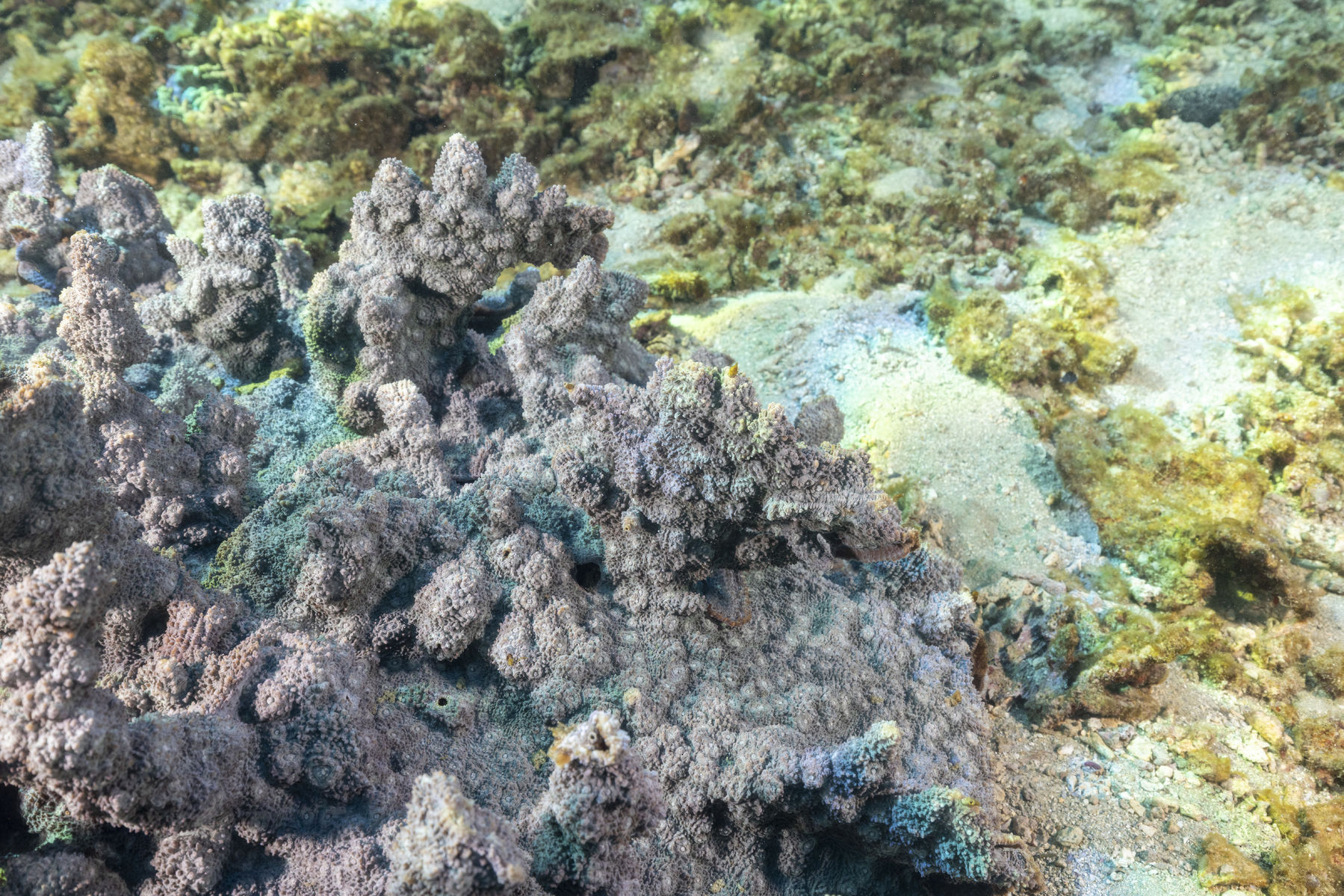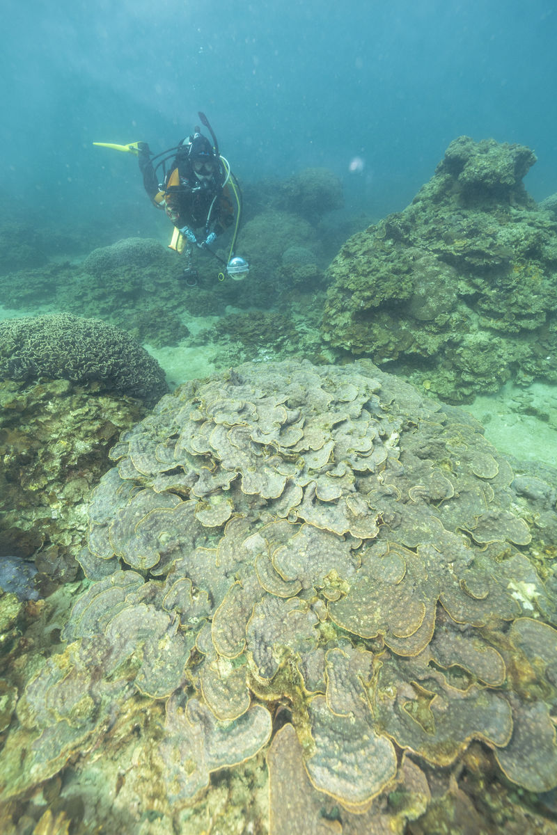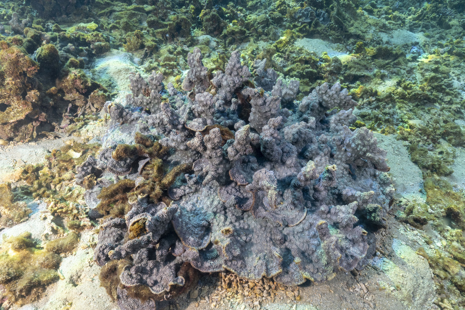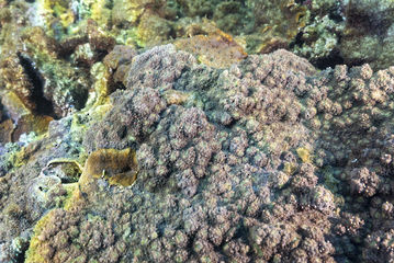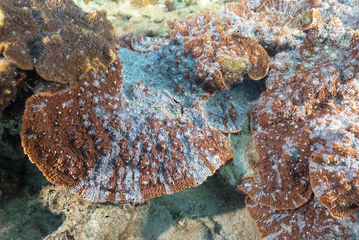 群体の形は葉状や被覆状で、群体の表面はトゲトゲしている。群体数も多く普通種。大型の群体もあり目立つ。サンゴ個体の突出は、群体によって異なるため見分けるのが難しい。ウスカミサンゴに似ているが、群体表面のトゲトゲやサンゴ個体のつき方で見分けられるので、図鑑の写真を見比べてください。
