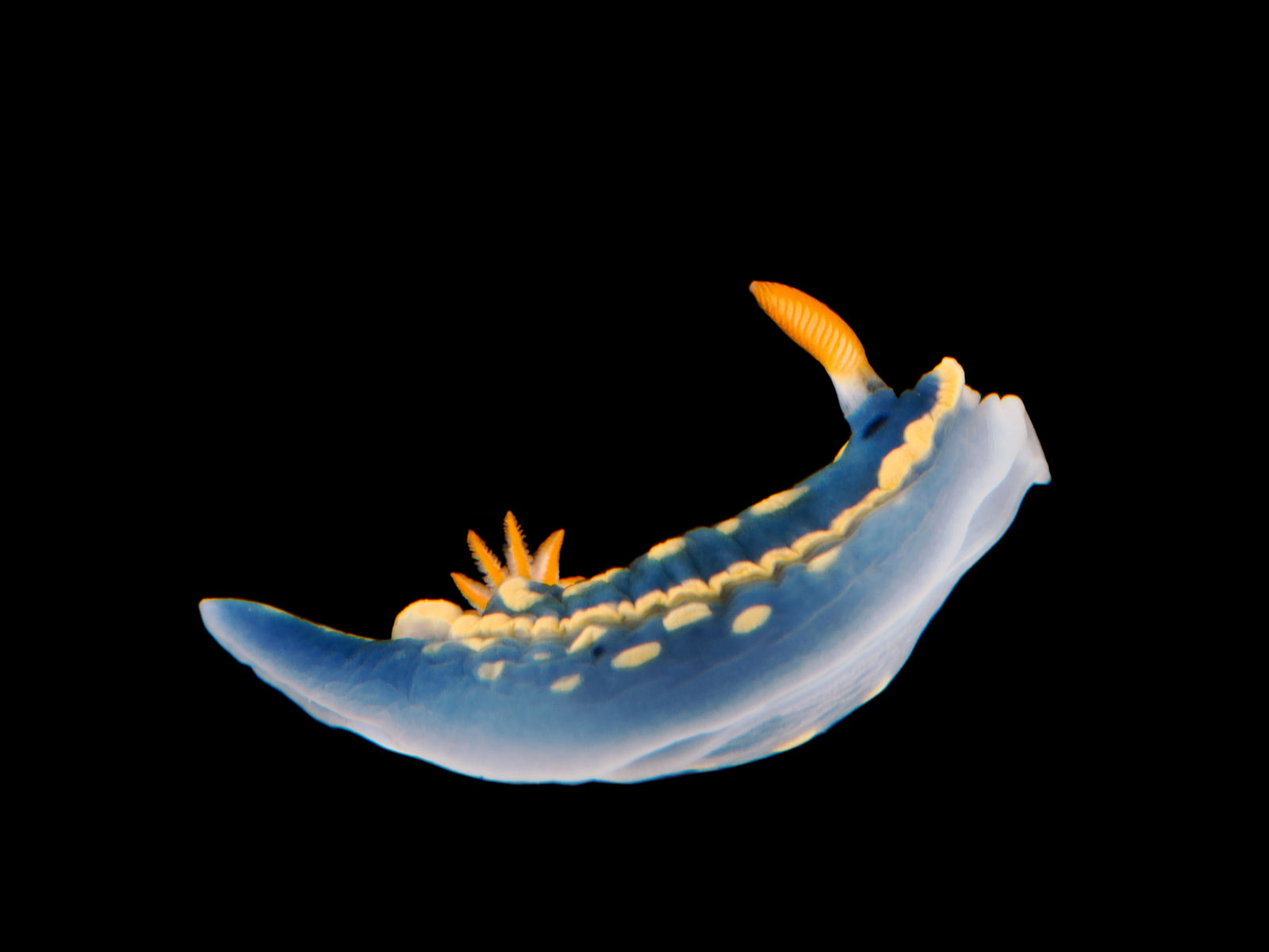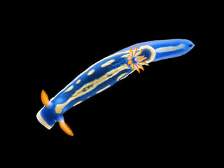 最も普通にみられるウミウシ。体地色は青色で外套膜周縁部は黄色、正中線上に黄色の縦線が1本あり、その両側に黄色の斑紋がある。黒色の斑紋が不規則に入る個体もいる。触角は橙色、二次鰓は白色で、軸は橙色。体長30 mmほど。クロイソカイメンを食べる。沖縄を除く日本沿岸に広く分布し、タイドプールや潮下帯(10 m)くらいの転石上や岩上で見られる。