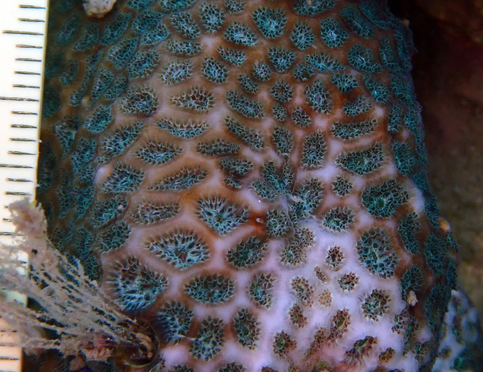 個人的には好きなサンゴですが、見た目が地味なサンゴ。昼間から触手に覆われていることも多くサンゴの形が目立たない。色は緑や茶褐色など、よく見ると綺麗で、美しいルリツボムシが穿孔している。サンゴ個体の大きさは1 cm未満で小さい。以前はトゲルリサンゴと呼ばれていたが、現在はアツギルリサンゴと呼ばれている。目立たないだけで、どこにでもいる普通種。