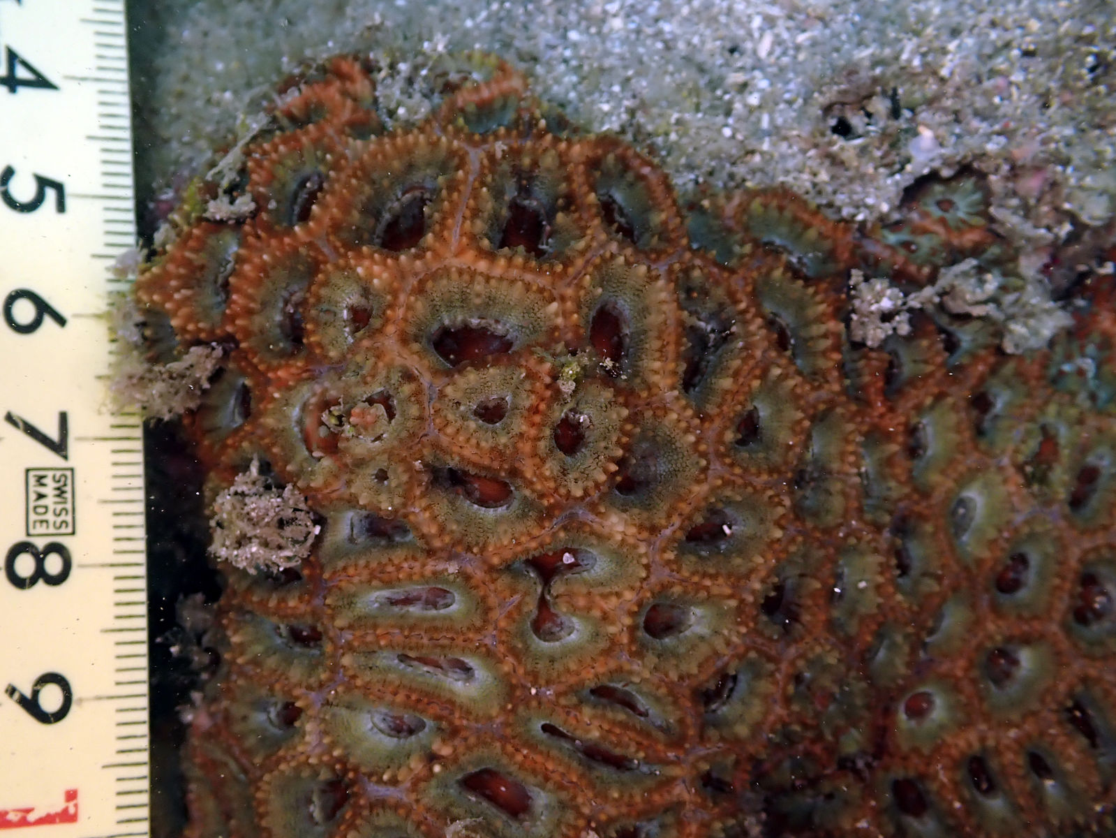 群体表面がトゲトゲしていて、サンゴ個体の大きさは1cm未満。アマクサオオトゲキクメイシよりはサンゴ個体が大きい。色は緑や赤、本写真のようなものなど豊富。アマクサオオトゲキクメイシと比べると、本海域では出現頻度は低い。