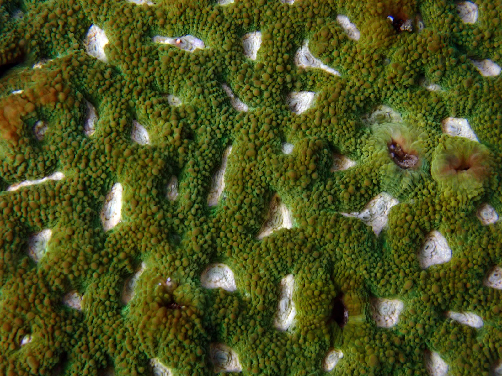 サンゴの群体形は被覆状。色は緑、赤、茶褐色などさまざま。群体は大型になることもある。