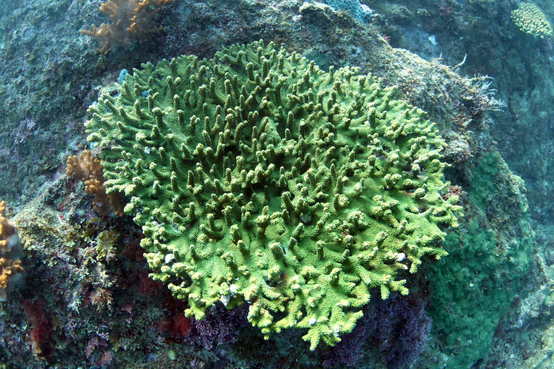 クシハダミドリイシと並んで、高知県を代表する卓状サンゴのひとつで、潮通しのよい水深10 mまでの海域で普通に見られ、本種が優占することもある。クシハダミドリイシより骨格や岩の固着が強固なため、波あたりの強い環境でもよく見られる。一方で、亜熱帯や熱帯のサンゴ礁域ではほとんど見られない。