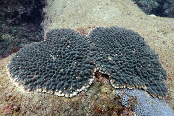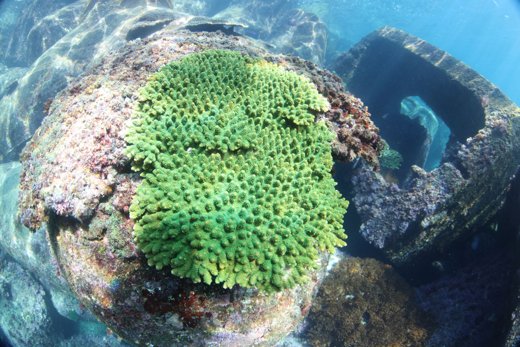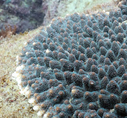 群体は岩を覆うように成長することが多く、群体の外周部では枝が伸びることもあります。大仏さんの頭のように円錐形の短い指状の枝がたくさん出ているのが特徴です。もともとはサンゴ礁海域にいるオヤユビミドリイシに似ていることから、オヤユビミドリイシの一種として記録されていましたが、高緯度サンゴ群集域に生息しているものについては形態が大きくことなることから2000年に新種記載されました。その後和名については野村・目﨑2005にて「ニホンミドリイシ」となりました。竹ヶ島や甲浦では、外洋側で見られますがそれほど多くはありません。高知県の西南部や土佐湾内では普通種でレア度は星1ですが、本海域では珍しいため星3としました。