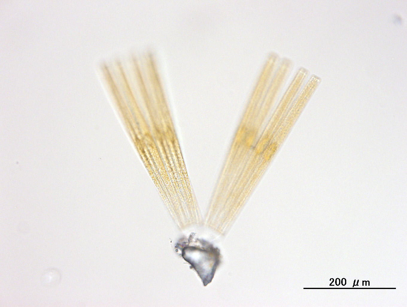 海産付着性珪藻。殻の末端から粘液を出して器物に付着する。写真では小石に粘液で付着しているのがわかる。