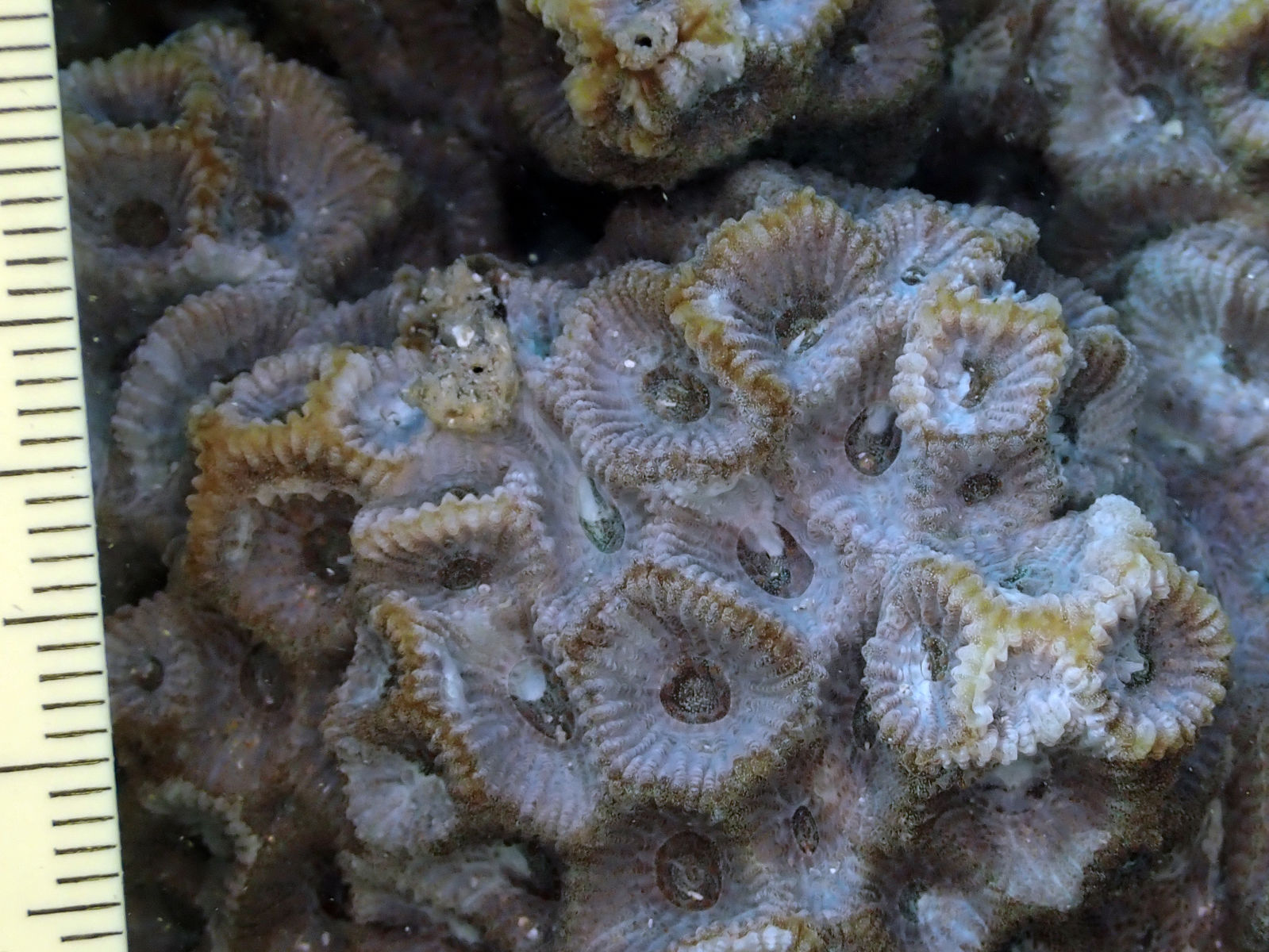 ヒュウガパリカメノコキクメイシにサンゴ個体がよく似ていますが、群体形が盛り上がることで本種だと見分けられます。