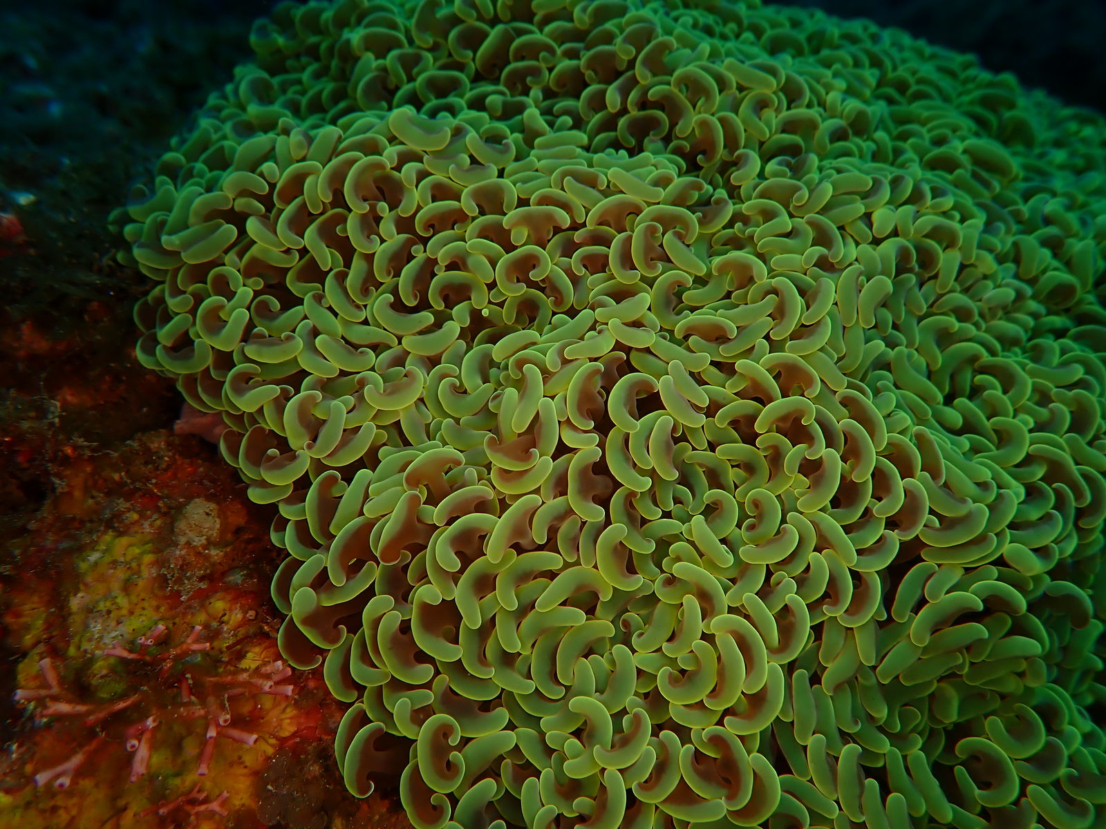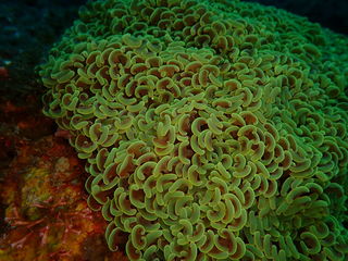 昼間から触手を伸ばしているのでイソギンチャクの仲間に間違えられますが、骨格があるイシサンゴの仲間です。触手の先端は肉厚で二股に分かれており、色彩は写真のように鮮やかな緑色は珍しく、だいたい褐色や灰色をしており地味です。高知県沿岸でもいるところにしかいないサンゴで、甲浦では稀です。