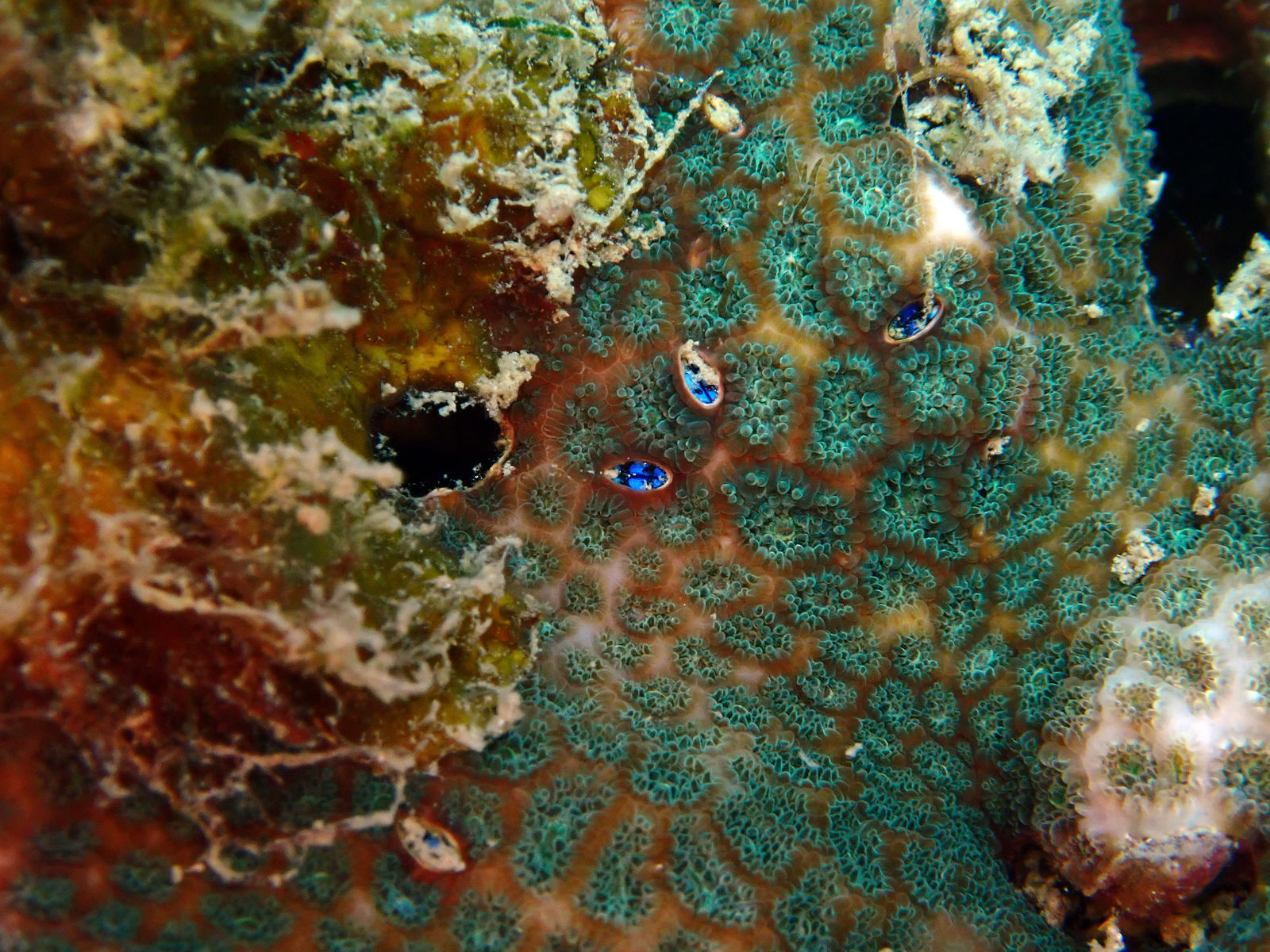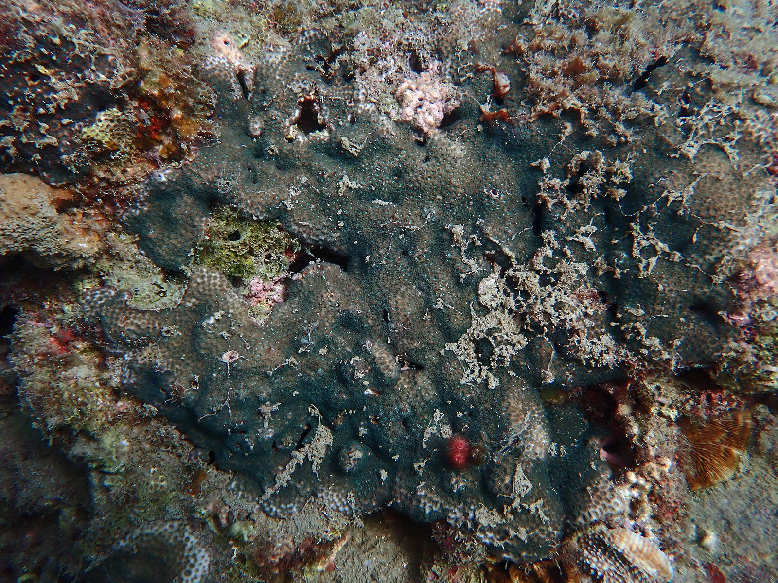 竹ヶ島や甲浦周辺では普通に見られるサンゴで、色彩は緑や茶色になる。群体の形は岩を覆うような被覆状や準塊状になるが、地味であまり目立たない。昼間から触手を伸ばしていることが多い。サンゴの表面をよく見ると、瑠璃色のきれいなる李ツボムシの仲間が穿孔していることが多く、被写体としても見栄えがよい。これまでの図鑑では、Leptastrea pruinosa と同定されていることが多く、最近ではLeptastrea sp. ATSUGI と書かれている場合もある。