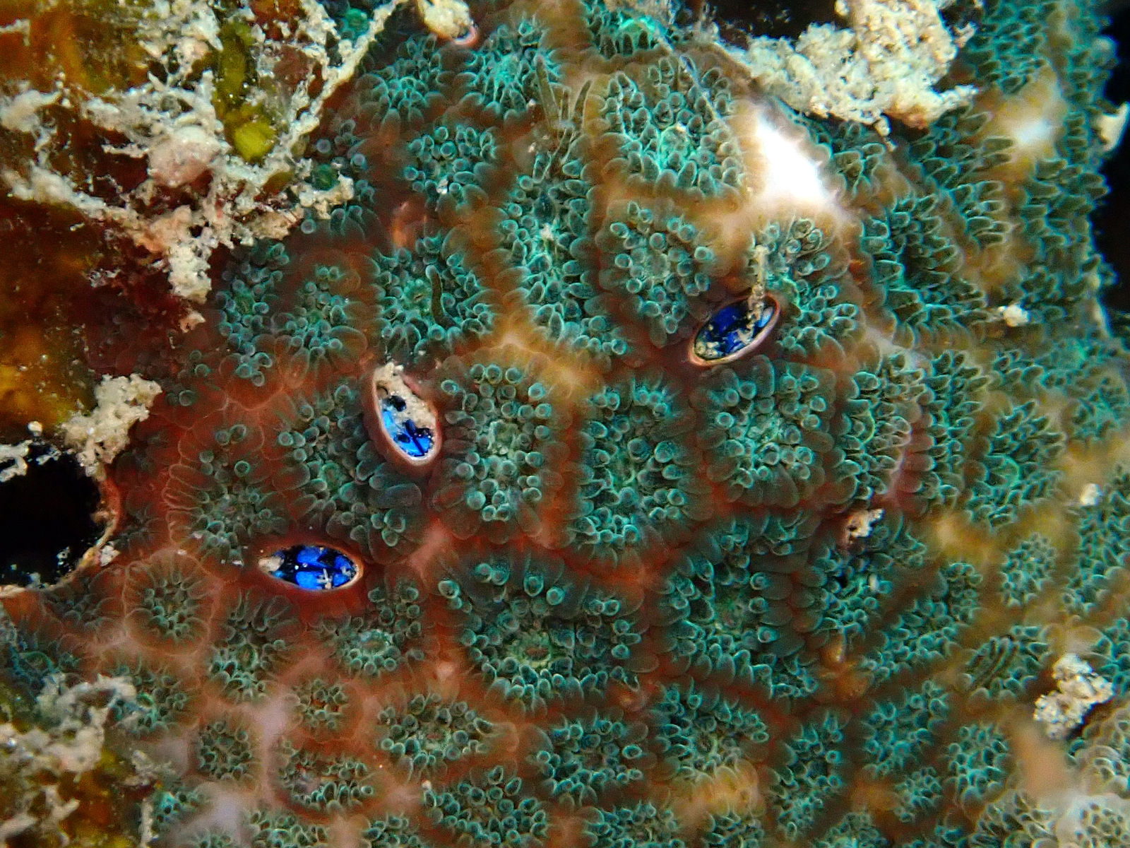 個人的には好きなサンゴですが、見た目が地味なサンゴ。昼間から触手に覆われていることも多くサンゴの形が目立たない。色は緑や茶褐色など、よく見ると綺麗で、美しいルリツボムシが穿孔している。サンゴ個体の大きさは1 cm未満で小さい。以前はトゲルリサンゴと呼ばれていたが、現在はアツギルリサンゴと呼ばれている。目立たないだけで、どこにでもいる普通種。