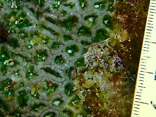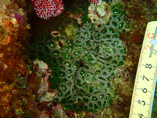 群体形は準塊状で、ほとんどの場合は群体が岩を覆うように成長する。群体の色は多彩で、赤、緑、灰などになる。ゴカクキクメイシなどに似るが、サンゴ個体は小さく表面がわずかにトゲトゲしているので見分けることができる。高知県や徳島県など高緯度サンゴ群集域では普通種。10 mより深いところではあまり見られない。
