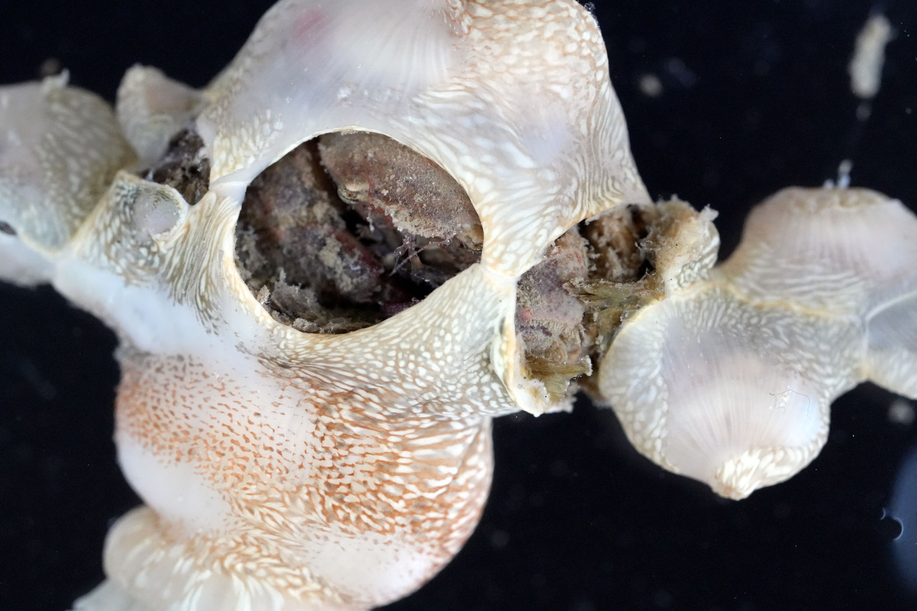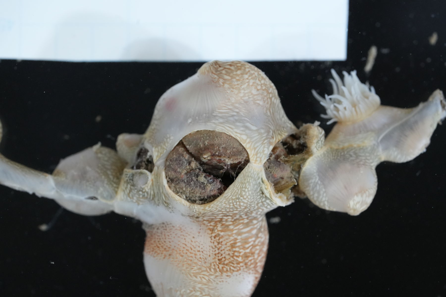 ナシジイソギンチャクやウスアカイソギンチャクに共生するカニの1種です。甲はよく膨らみ甲域は不明瞭。額は1葉で毛が並んでいます。前側縁は僅かに膨らむ程度の丸い4葉からなります。イソギンチャクの足盤と基質の間にあるクチクラ質の被膜と基質との間に空洞を形成し、その中に棲みこむことが知られています。
