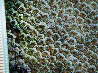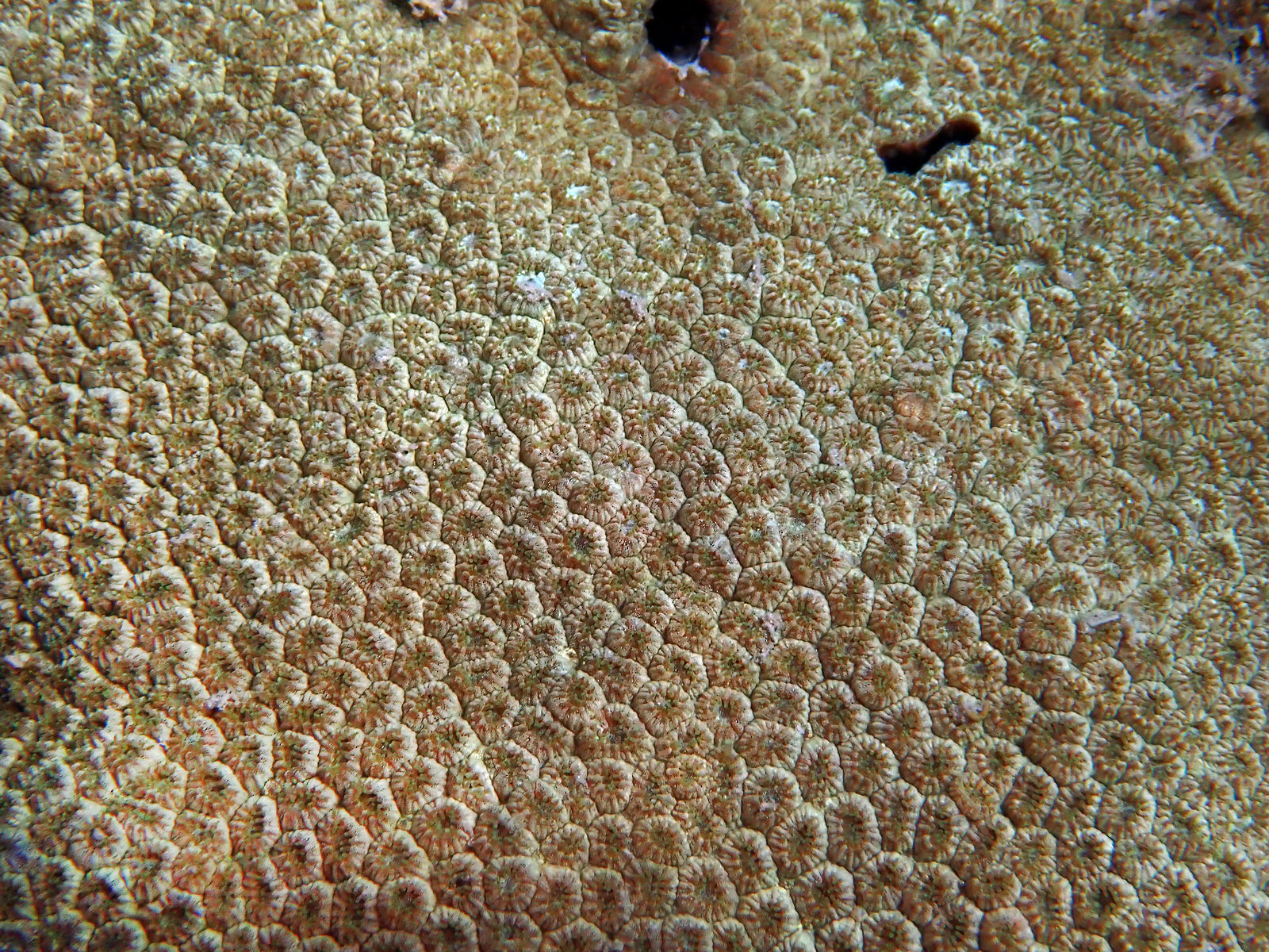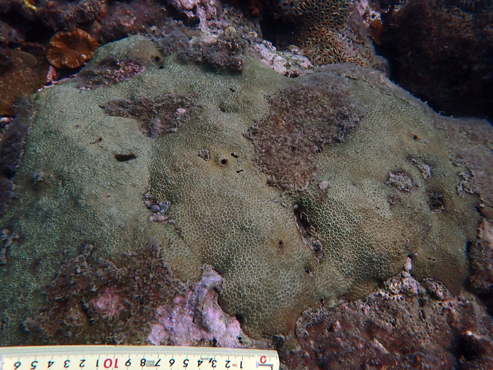 群体の形は塊状から準塊状で、環境変化に強いので、内湾、波当たりの強い消波ブロック、浅場から深場までといろいろな場所で見られます。色は緑色が多く、サンゴ個体は小型で大きさがよく揃っています。トゲキクメイシの仲間にサンゴ個体の大きさで良く似ていますが、サンゴ個体間にトゲがなく、密になっていることで見分けられます。