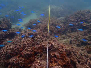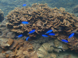 鮮やかな青色の体色をもつスズメダイの仲間。大きさは7~8 cm。沿岸の岩礁やサンゴの周辺に生息する。高知県の沿岸でも最も普通にみられる種で、シュノーケリングやダイビングの際にはゲストとして皆勤賞クラスの働きを見せる。