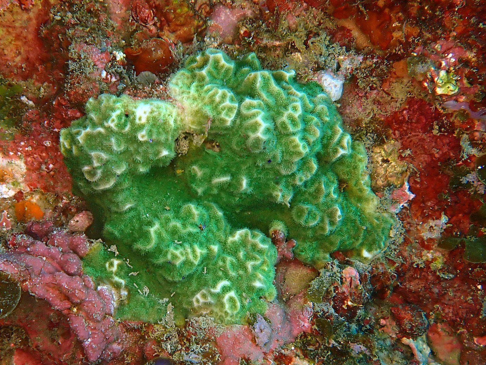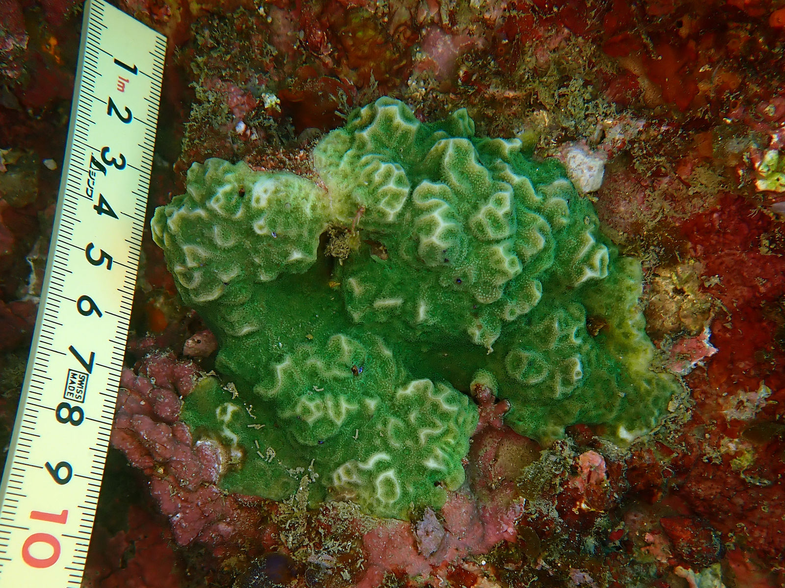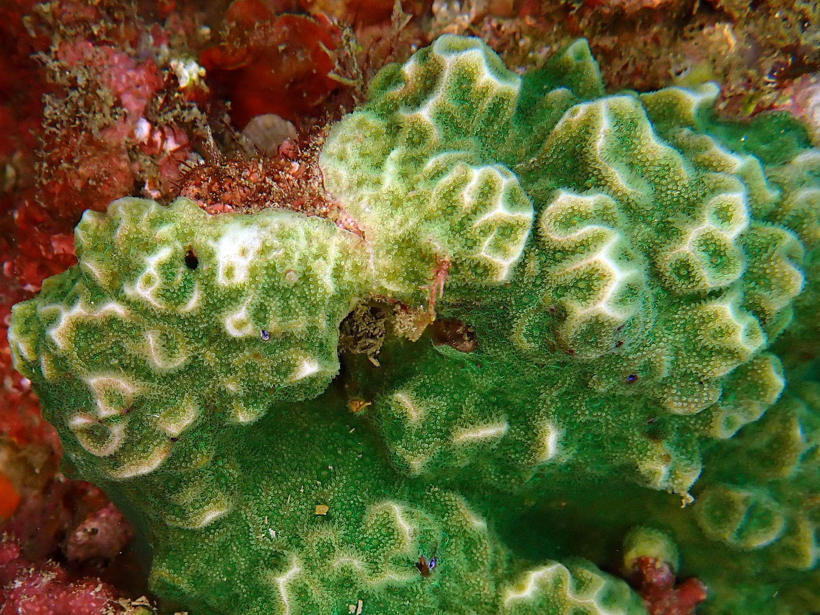 サンゴだと気が付きにくいため、あまり認識されていないがよく見ると普通にいるサンゴ。色彩は茶褐色が多く、写真のような緑色は少数派です。群体の形は被覆状から塊状になり、サンゴ骨格は種名の通り網目のようになっている。ヤスリサンゴにも似るが畝の幅やサンゴ個体の大きさは本種の方が小さい。