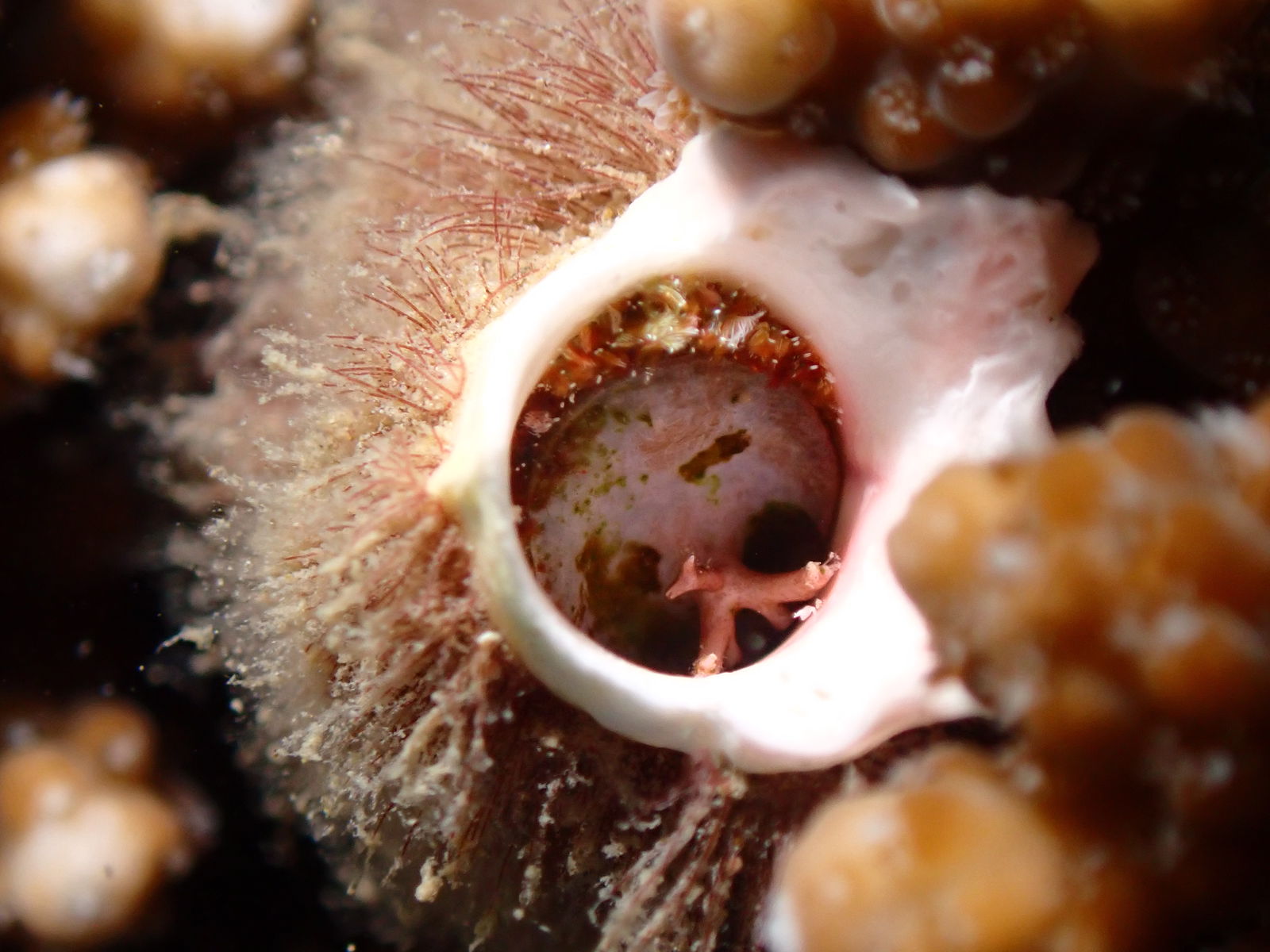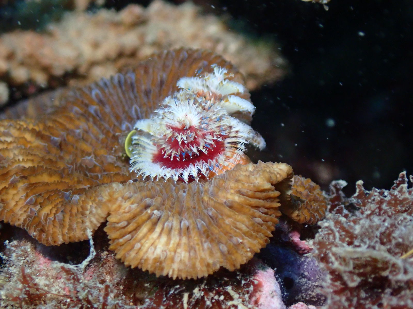 通常、イシサンゴ類の骨格内に石灰質の棲管を作って住んでいるカンザシゴカイ科の1種です。サンゴの外に出ているカラフルな部分は鰓冠部とよばれ、呼吸や水中の微細な有機物を摂餌するために用いられています。鰓冠部の色彩や模様には様々なバリエーションがあります。