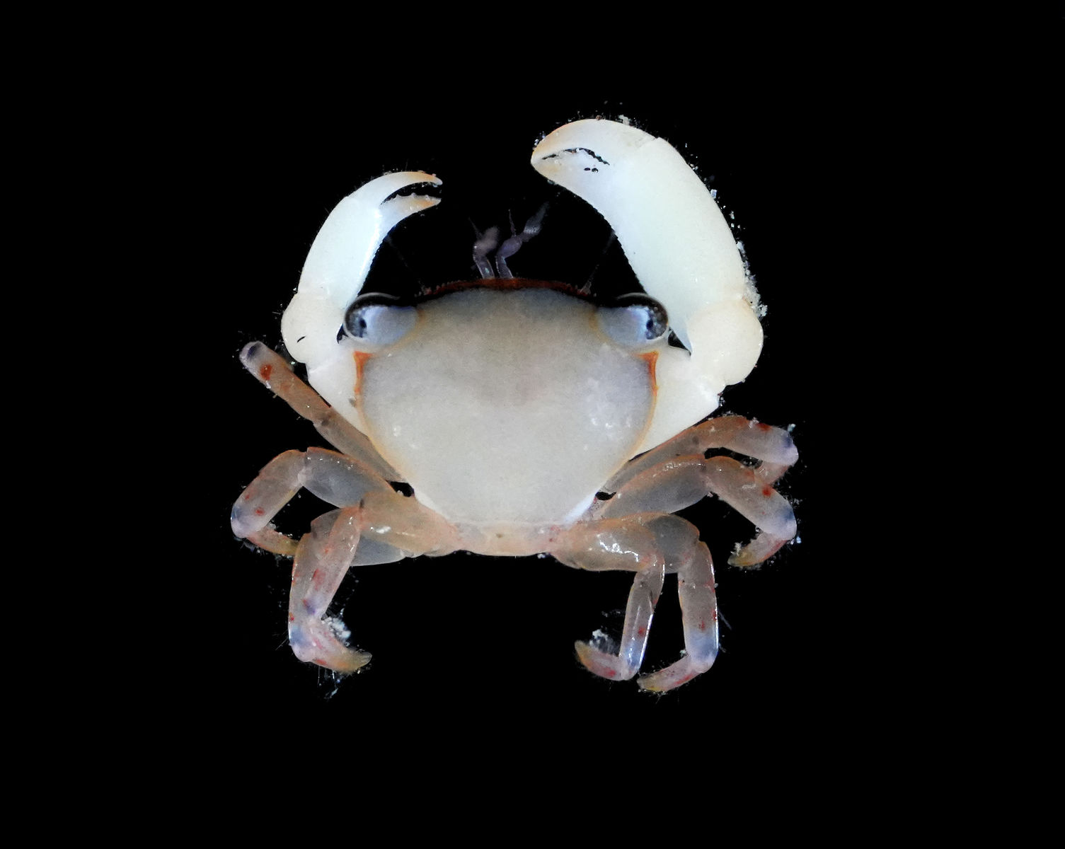ミドリイシ属のイシサンゴ類に共生するカニで、サンゴの粘液を餌として利用しています。歩脚の前節末端に濃い青色の斑があります。